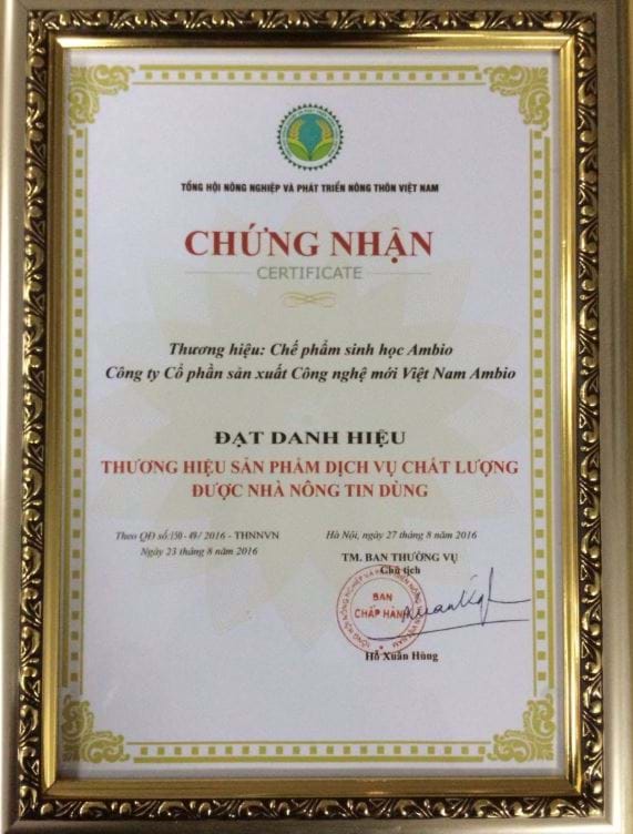 Ngày 27 tháng 8 năm 2016, Công ty Cổ phần sản xuất Công nghệ mới Việt Nam Ambio đã vinh dự nhận cúp vàng "Thương hiệu sản phẩm chất lượng được nhà nông tin dùng" Tại buổi Vinh danh “Thành tựu phát triển ngành nông nghiệp Việt Nam gắn với xây dựng Nông thôn mới” do Tổng hội Nông nghiệp và Phát triển nông thôn Việt Nam tổ chức.