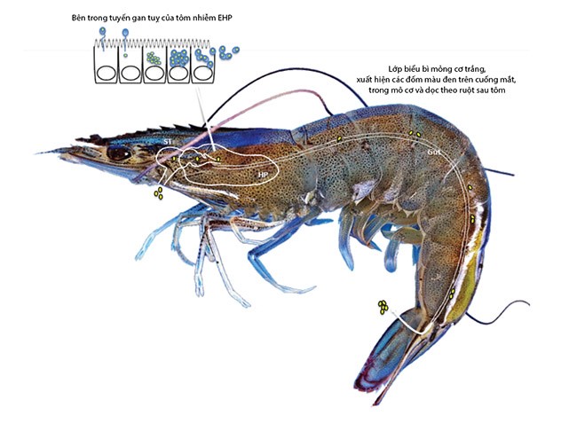 Tôm bị nhiễm bệnh EHP sẽ có lớp biểu bì mỏng, cơ màu trắng như một biểu hiện của việc tôm đang bị stress. Xuất hiện các đốm màu đen trên cuống mắt của tôm, trong mô cơ và dọc theo ruột sau tôm.