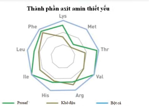 Khả năng tiêu hóa của các axit amin thiết yếu trong Prosaf cũng được đánh giá trong một thử nghiệm in vivo tương tự. Kết quả đã chỉ ra, khả năng tiêu hóa của những axit amin thiết yếu trong Prosaf thường vượt 95% và tương tự như kết quả đã được ghi lại trong khẩu phần ăn chứa bột cá, với ngoại lệ là Methionine và Cysteine - 2 axit amin chứa sulfur thường bị hạn chế trong các khẩu phần ăn chứa thực vật.