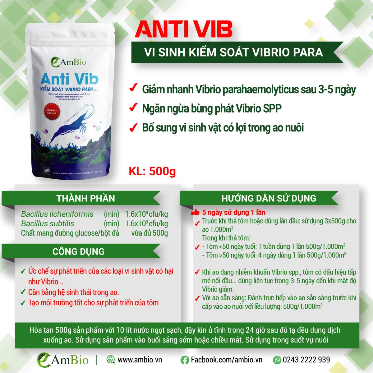 - Áo chế trực tiếp Vibrio Para: AnTi Vib chứa các chất diệt khuẩn mạnh mẽ, tác động trực tiếp vào Vibrio Para, ức chế sự phát triển hiệu quả.