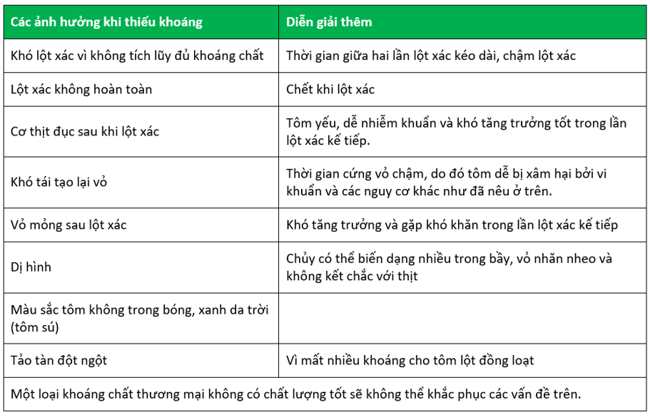 Bảng những ảnh hưởng khi thiếu khoáng chất chất lượng trong nuôi tôm