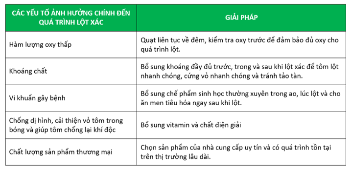Nếu tôm không thể lột xác thì sự sống của chúng coi như đã kết thúc và người nuôi sẽ mất mùa. Vì vậy, tóm tắt lại một cách ngắn gọn và dễ nhớ nhất, người nuôi có thể lưu ý những điểm căn bản dưới đây để thực hành trong ao tôm của mình sao cho tôm có đầy đủ điều kiện để vượt qua giai đoạn khó khăn một cách nhanh chóng và hiệu quả nhất.